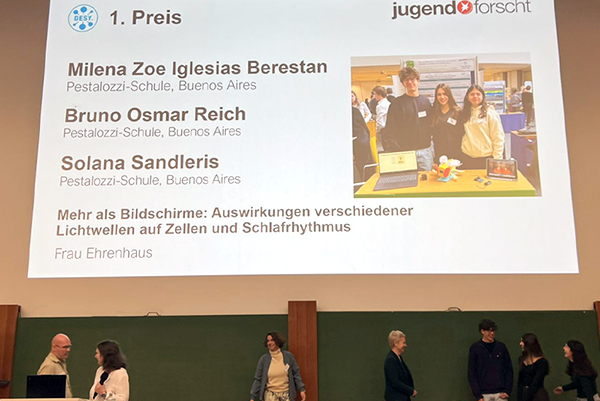 El 8 y 9 de abril, Milena Iglesias Berestan, Bruno Reich y Solana Sandleris presentaron nuevamente su proyecto de investigación en la instancia provincial de Hamburgo del concurso Jugend forscht y obtuvieron el 1er premio en la categoría Biología, logrando así su clasificación a la final nacional en Alemania.